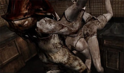 Some of the most intense sections revolve around the character named by fans as "Pyramid Head". Pyramid Head is one of the most metaphorical characters ever in video games, you could write an essay on just this one character (well I could anyway), he resembles alot of different things, guilt, punishment, shame, disgrace, restoration in humanity, executioner and so on. Of course he is also the root of many disturbing scenes like the infamous rape scene -as pictured below- This creature will give chase to you many times throughout the town, strangely enough however you seem to survive each time as he seems to lose interest in chasing you and simple walks away disappearing for a while, making you wonder why he isn't trying very hard to catch you it's almost as if he is toying with you.